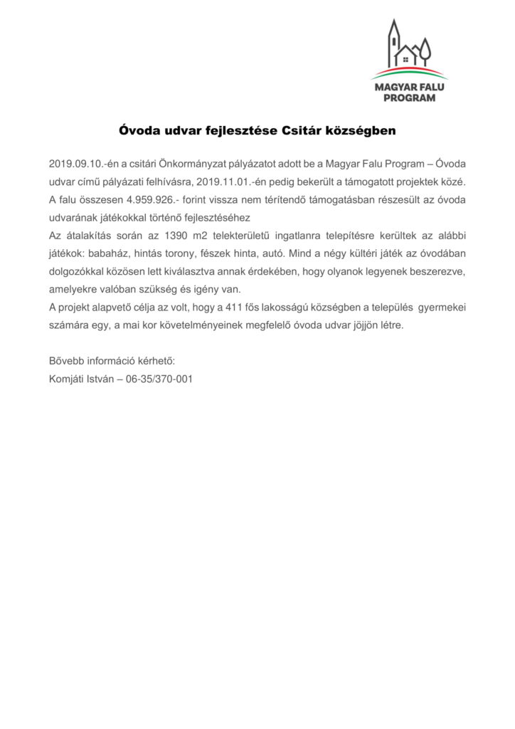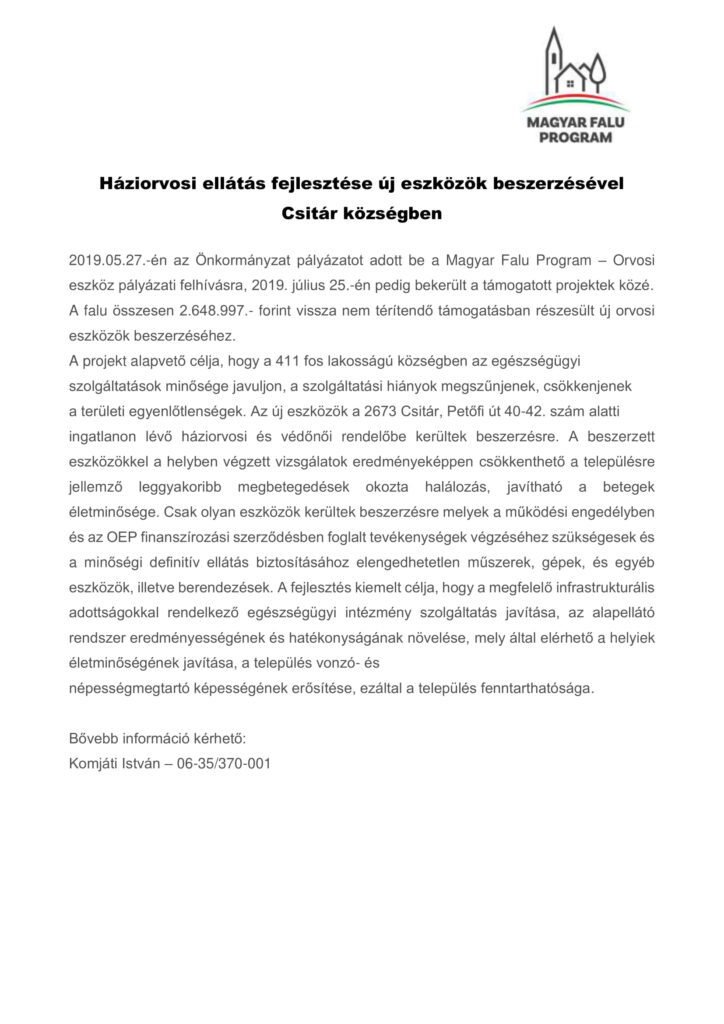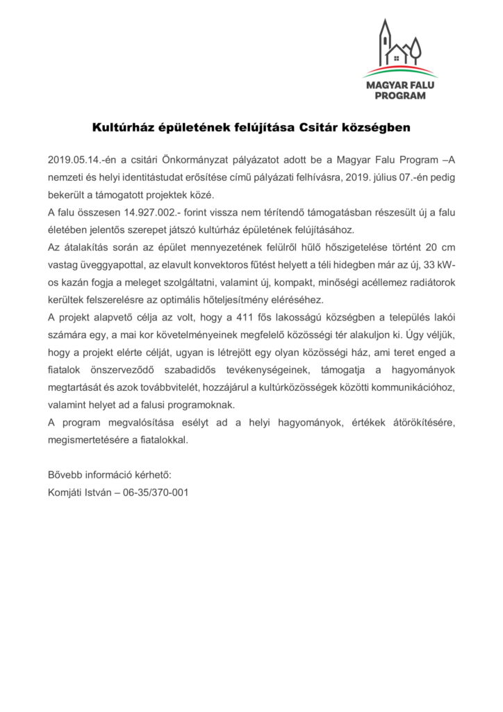 Csitár Község Önkormányzata a Magyar Falu Program keretében meghirdetett Közösségszervezéshez kapcsolódó eszközbeszerzés és közösségszervezö bértámogatása – 2022 címu, MFP-KEB/2022 kódszámú pályázati kiírásra benyújtott pályázatán 2.284.659 Ft támogatásban részesült.